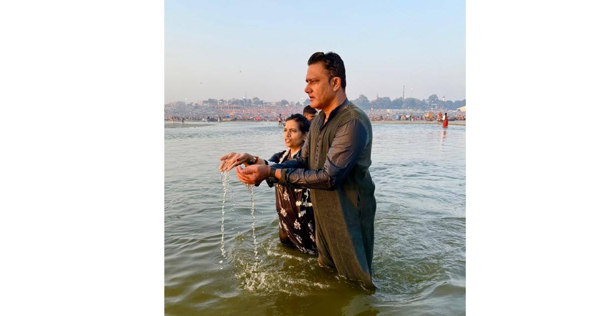 Cricket legend Anil Kumble and his wife Chetana Ramathirtha visited the Maha Kumbh Mela and took a dip in the Triveni Sangam.