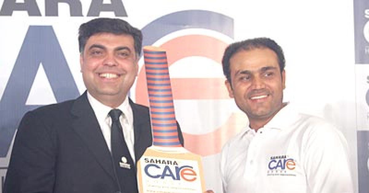 Romi Datta CEO, Sahara India Pariwar, International Business Division, presents a bat to Virender Sehwag, symbolising Sahara Care House batting for overseas resident Indians.