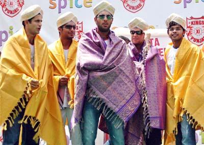 Members of the King's XI Punjab team, Irfan Pathan, Kumar Sangakkara, captain Yuvraj Singh, James Hopes and S. Sreesanth pose with the traditional Mysore Peta and shawl presented to them in Bangalore.