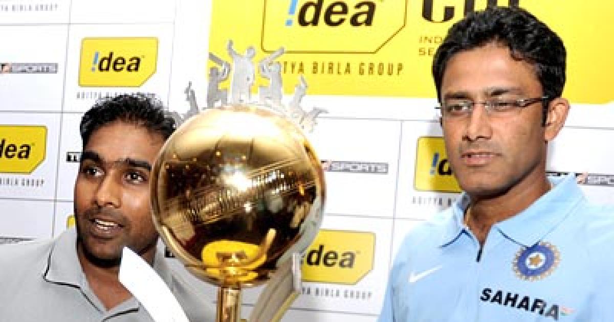 Image: Jayawardene and his Indian counterpart Kumble pose with the trophy at a press conference in Colombo on Tuesday. Photograph: Lakruwan Wanniarachchi/AFP/Getty Images