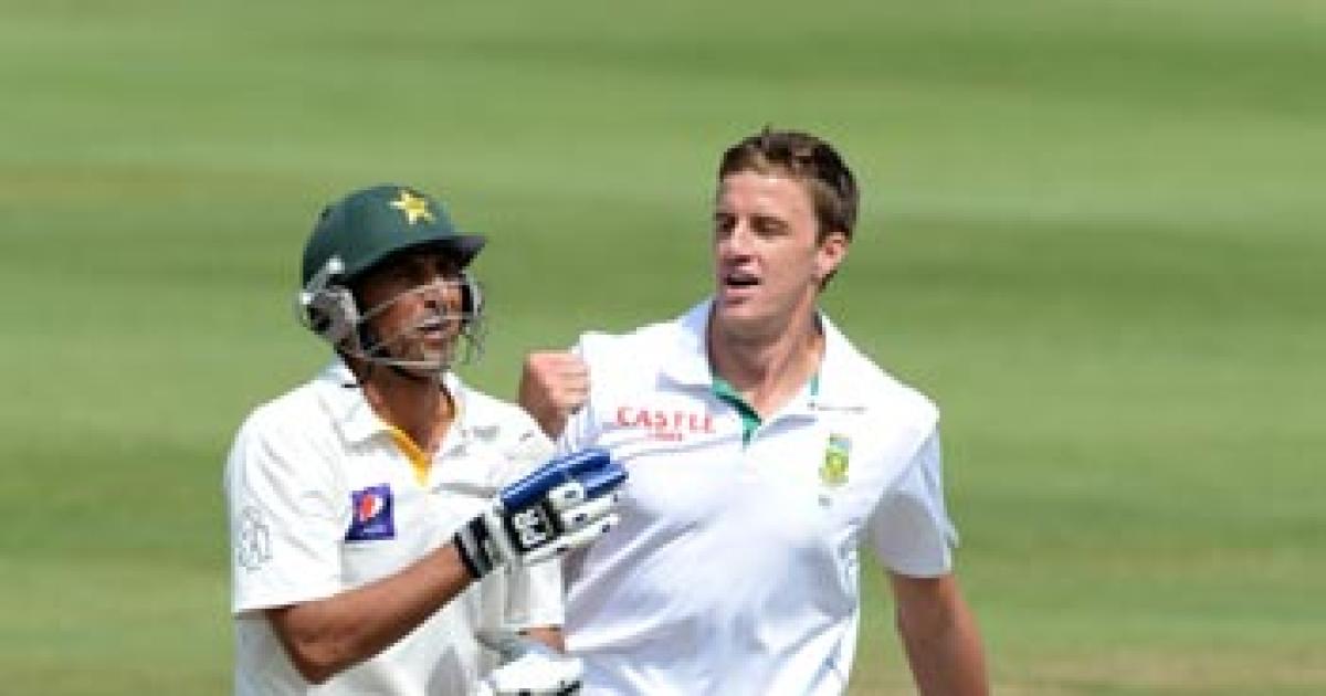 Younus Khan (15) was not sure whether to play or leave a Morne Morkel delivery and in the end did neither, a faint edge being snapped up by De Villiers to leave his side four down.