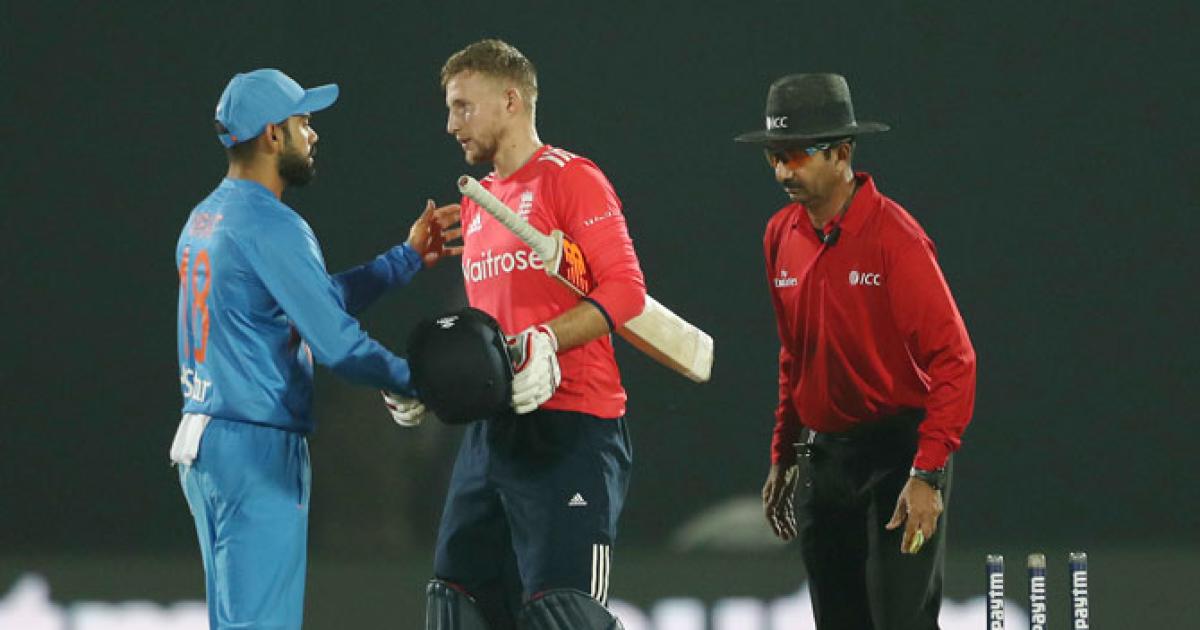 The second over bowled by Jordan saw a couple of plays and misses from Kohli before the star Indian batsman spanked the English pacer over mid on for a four.