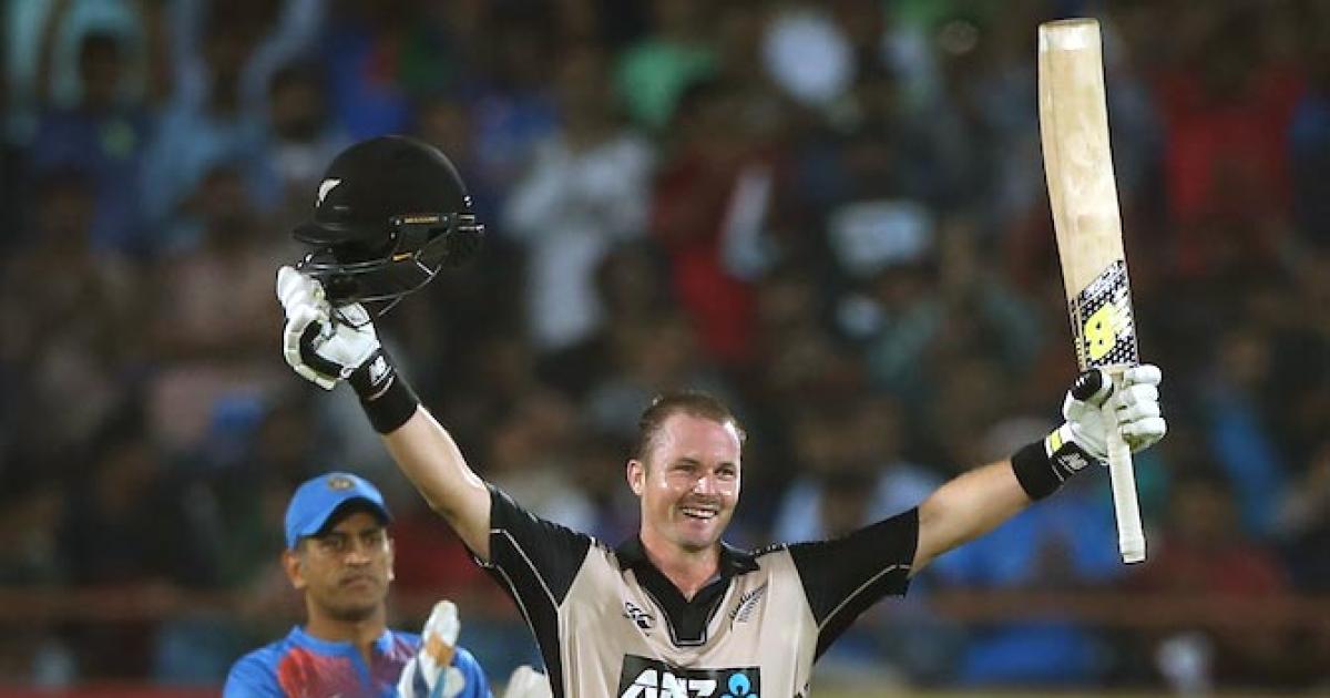 IMAGE: New Zealand's Colin Munro celebrates after scoring a century in the second T20I against India. Photograph: BCCI