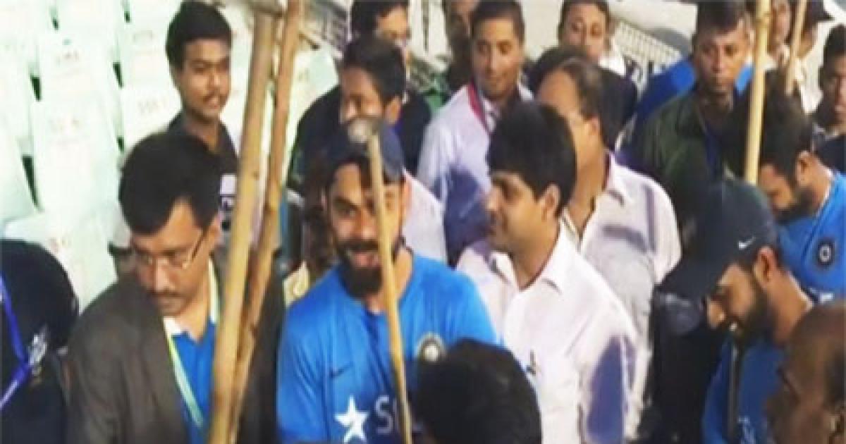 Image: A video grab of India's captain Virat Kohli and teammate Ajinkya Rahane (right) standing with brooms after day's play on Day 3 at the Eden Gardens in Kolkata on Sunday