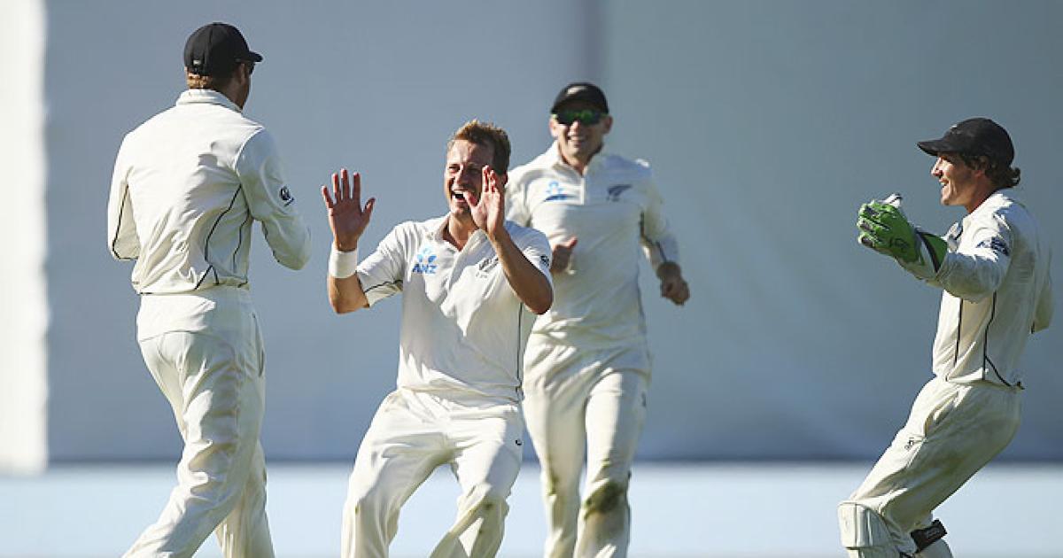New Zealand's Neil Wagner celebrates after taking the wicket of Australia's Steve Smith on Day 2 the 2nd Test at Hagley Oval in Christchurch on Sunday