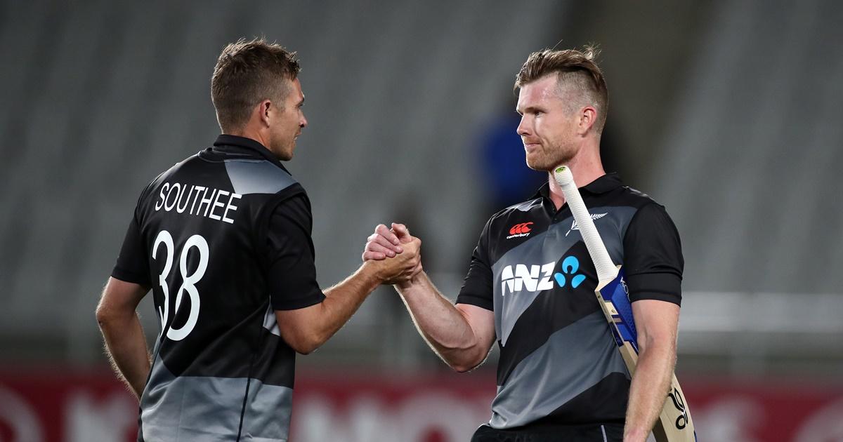New Zealand's top order let them down but Jimmy Neesham forged important partnerships with debutant Devon Conway and Mitchell Santner to seal victory with four balls to spare.