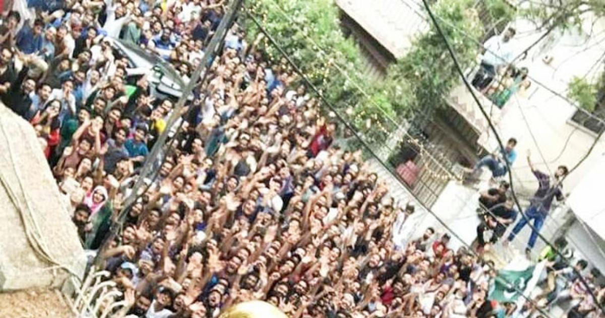 IMAGE: A local policeman uses a baton to disperse cricket fans gathered outside Sarfraz Ahmed's house in celebration of the Champion Trophy win. Photograph: Akhtar Soomro/Reuters