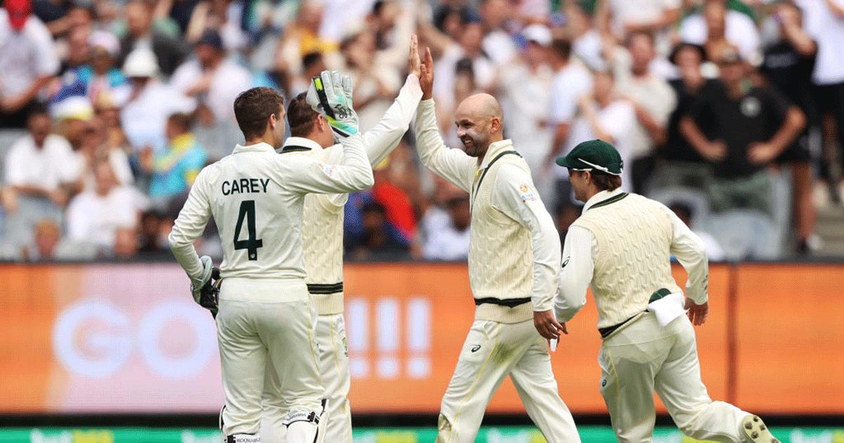 Nathan Lyon celebrates with teammates after dismissing Jos Buttler