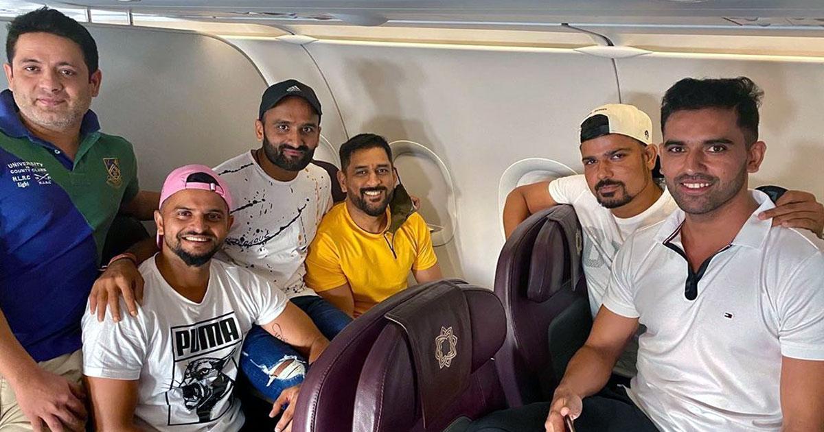 Captain Mahendra Singh Dhoni along with some of Chennai Super Kings teammates including Suresh Raina, Deepak Chahar, Piyush Chawla and Karn Sharma touched down in Chennai on Friday for their training camp ahead of next month's Indian Premier League in UAE.