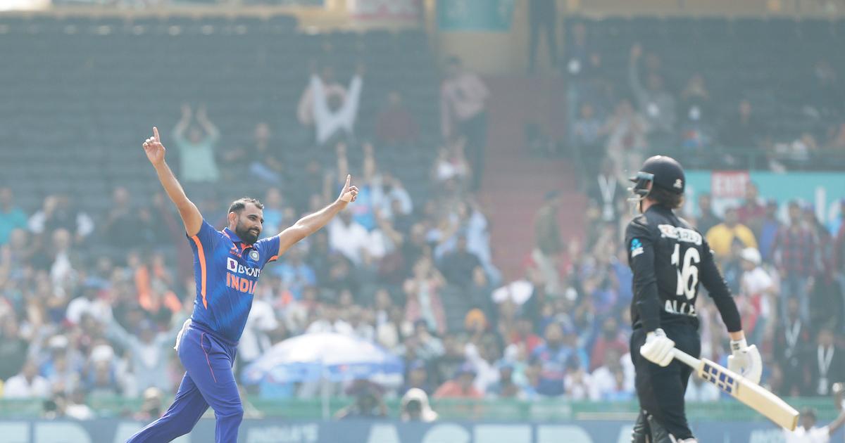 Shami got one to shape away and Daryl Mitchell, in his attempt to flick it on the on-side, ended up mistiming it back to the bowler.