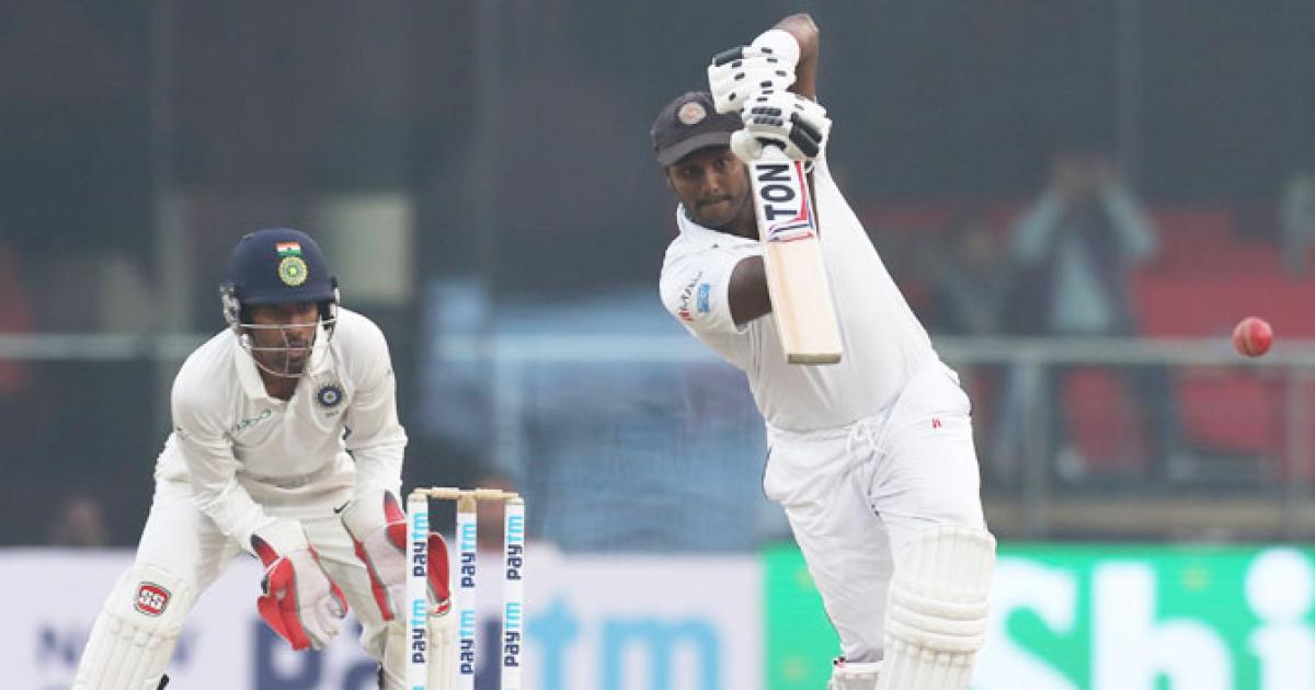 Angelo Mathews capitalised on an early reprieve to score 57 not out and skipper Dinesh Chandimal was on 25 with Sri Lanka still 405 behind on a hazy day in the Indian capital.