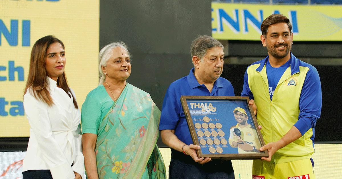 The legendary skipper plays his 200th match for CSK on Wednesday, and to mark the milestone, Dhoni was presented with a memento by frannchise owner N Srinivasan.