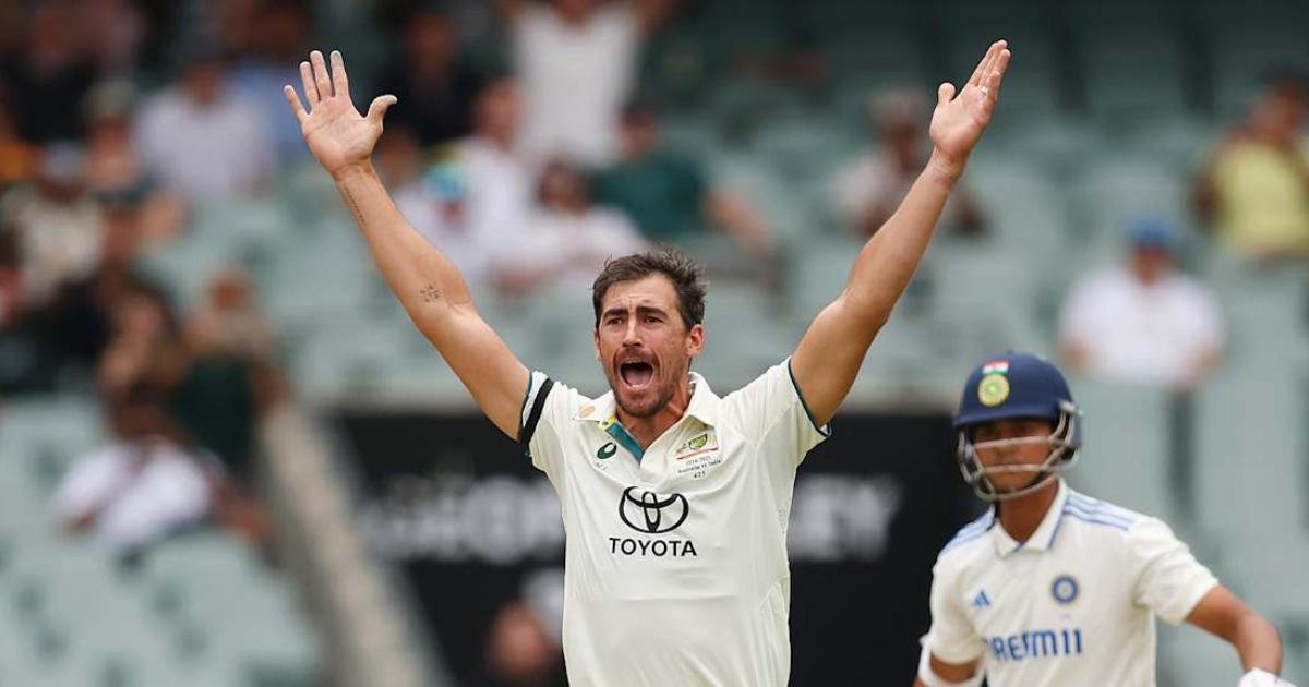 Mitchell Starc appeals for the wicket of Yashasvi Jaiswal on Day 1 of the pink ball 2nd Test in Adelaide on Friday
