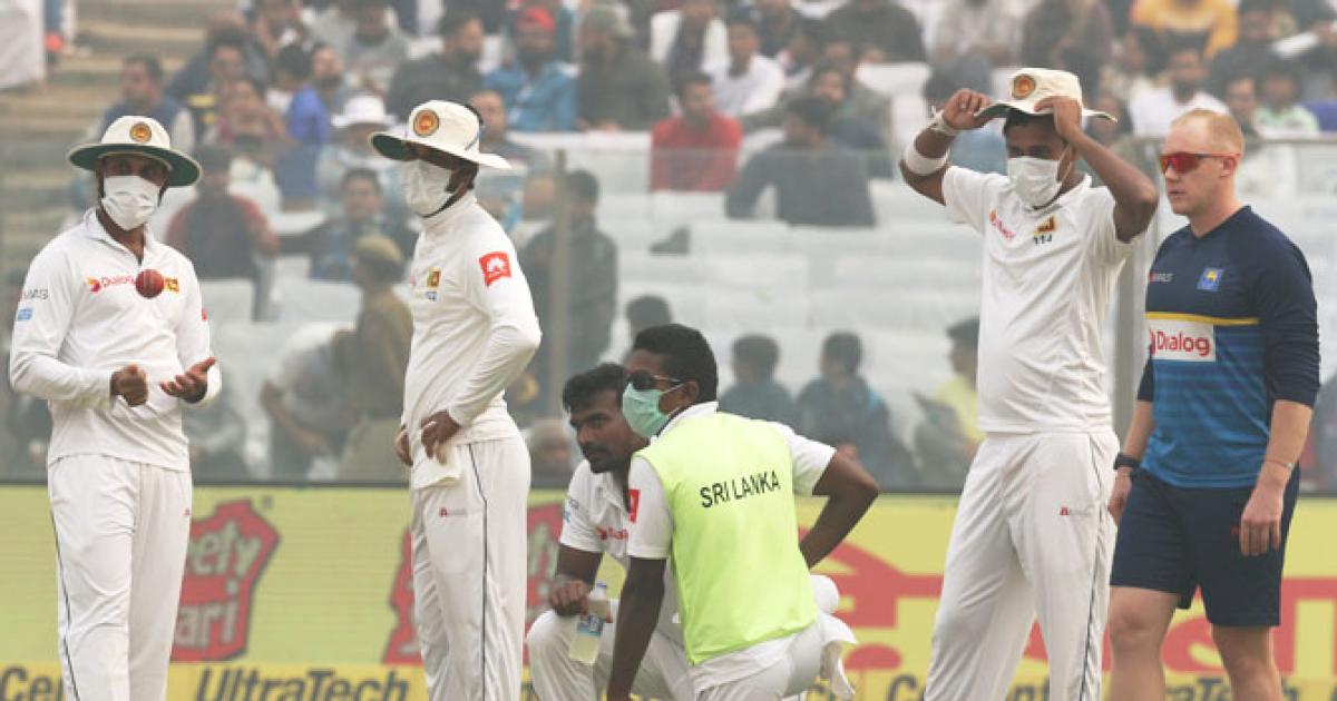 Several Sri Lankan players returned from the lunch break sporting facemasks as the seasonal haze affecting the region thickened over the Feroz Shah Kotla Stadium.