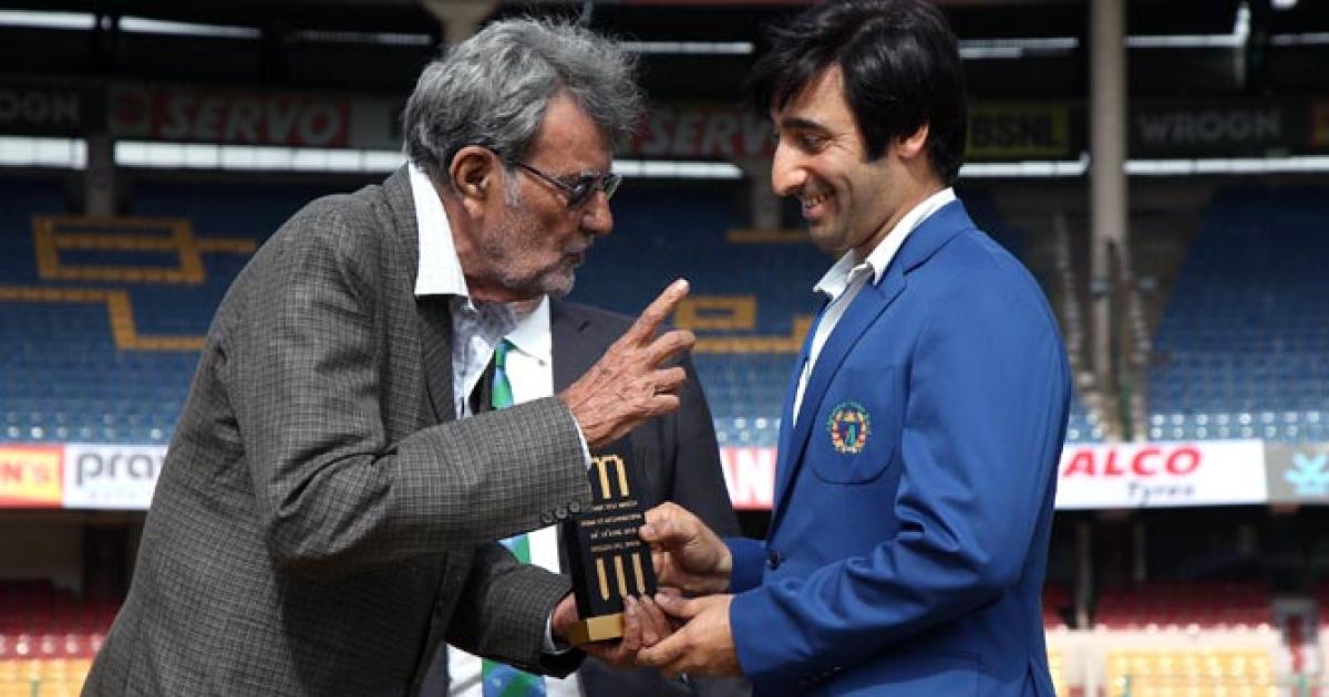 Afghanistan captain Asghar Stanikzai was presented with a memento from former India all-rounder Salim Durani, who was born in Kabul, before the match began.