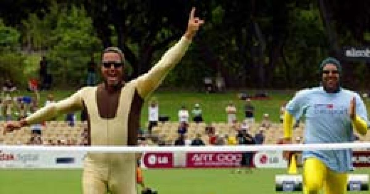 Batsman Mark Richardson cheered up New Zealand's suffering fans by winning a 110 metres sprint race against Australia all rounder Darren Lehmann at the Adelaide Oval on Tuesday.