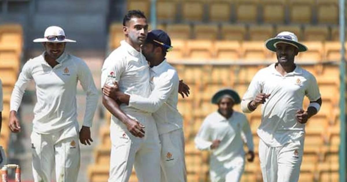 Vidarbha: 185 all out in 61.4 overs (Aditya Sarwate 47; Abhimanyu Mithun 5/45) vs Karnataka: 36/3 in 14 overs.