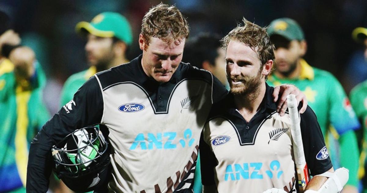 Martin Guptill of the Black Caps celebrates with Kane Williamson
