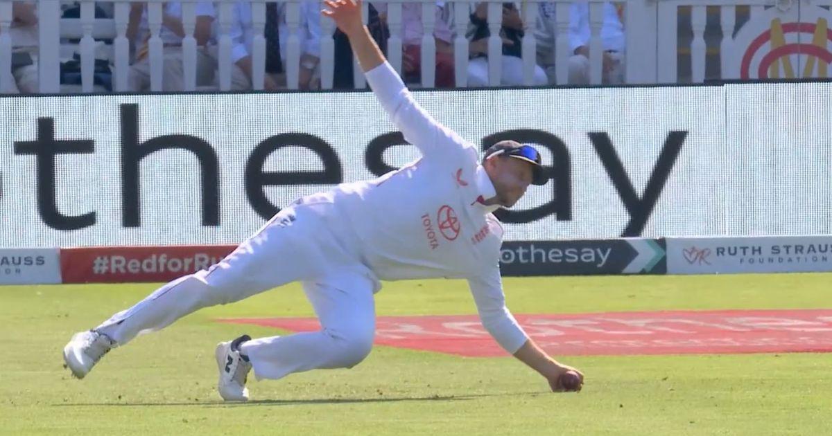 The ball glanced off the shoulder of the bat and flew between wicketkeeper Jamie Smith and the first slip. Root alert of the situation dove to his left and got hold of the ball with his left hand to produce a moment of magic in the field, forcing Nair to return on 40(62).