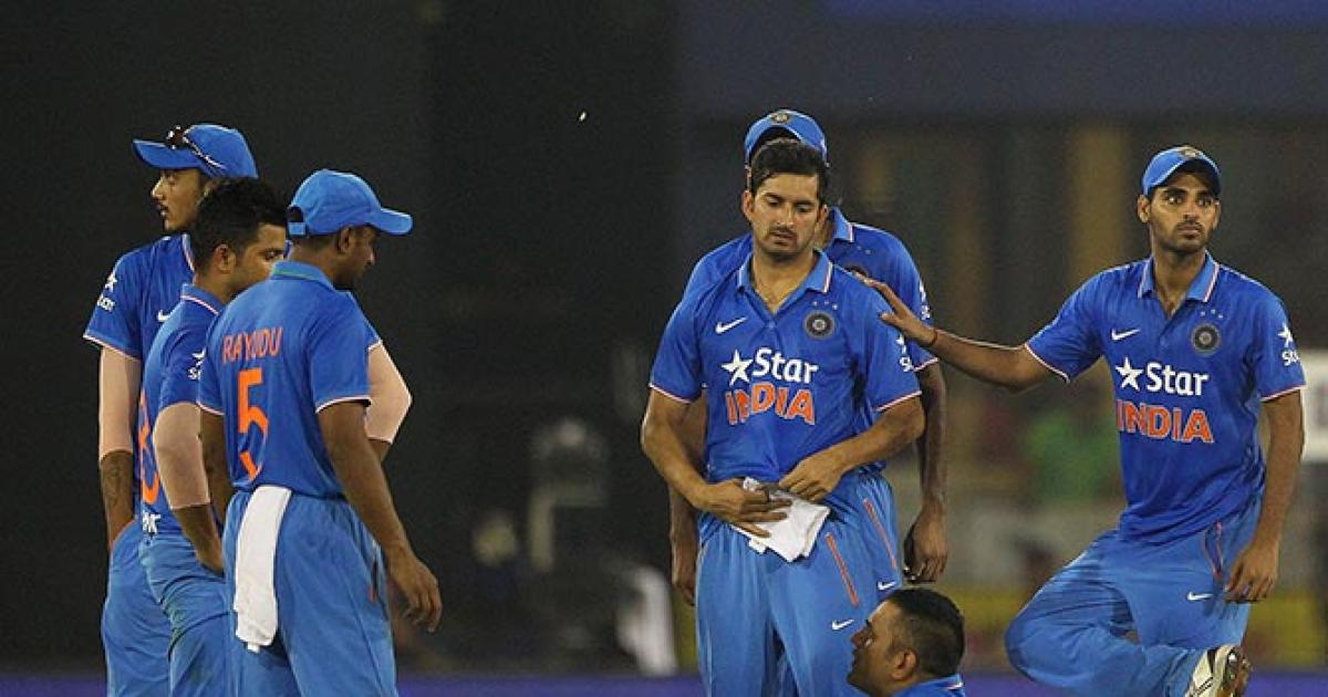 Indian players look on as play is suepended due to the crowd throwing bottles onto the pitch during the second T20 International in Cuttack