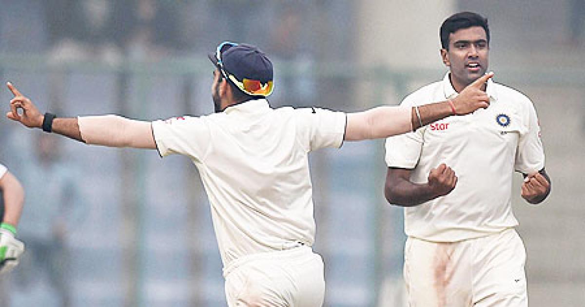 Image: India's R Ashwin celebrates the dismissal of South Africa's J P Duminy during final day of the fourth Test match at Feroz Shah Kotla Stadium in New Delhi on Monday