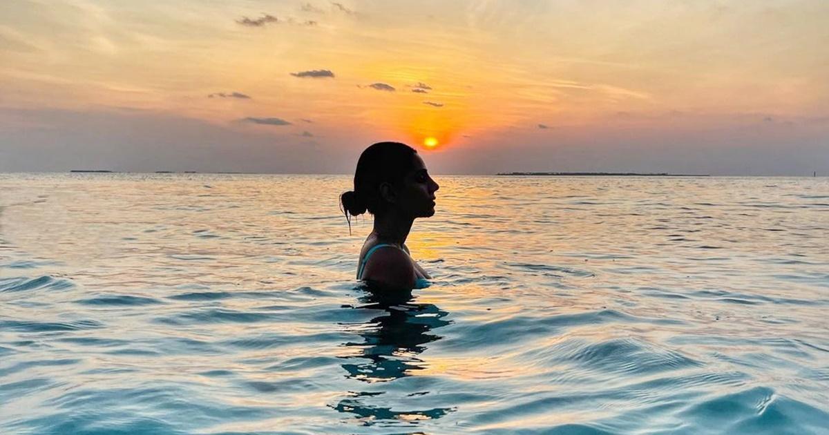 Television sportscaster Sanjana Ganesan shared a picture of herself in the sea with a stunning sunset in the background.
