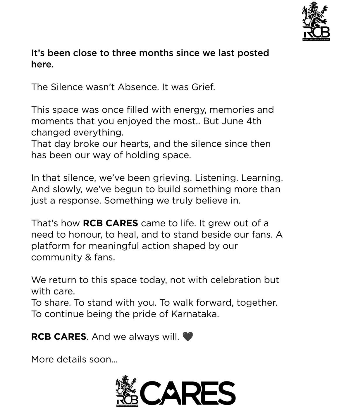 'We return to this space today, not with celebration but with care. To share. To stand with you. To walk forward, together. To continue being the pride of Karnataka,' RCB posted on Instagram on Thursday.