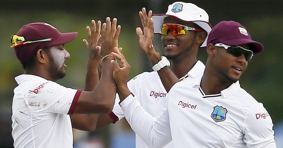 IMAGE: West Indies' Devendra Bishoo, left, celebrates with his teammates Kraigg Brathwaite, centre, and Shai Hope. Photograph: Dinuka Liyanawatte/Reuters