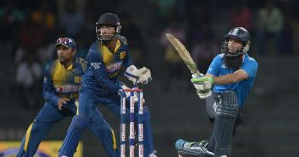 Image: England’s Moeen Ali bats as Sri Lanka’s Kumar Sangakkara watches on.