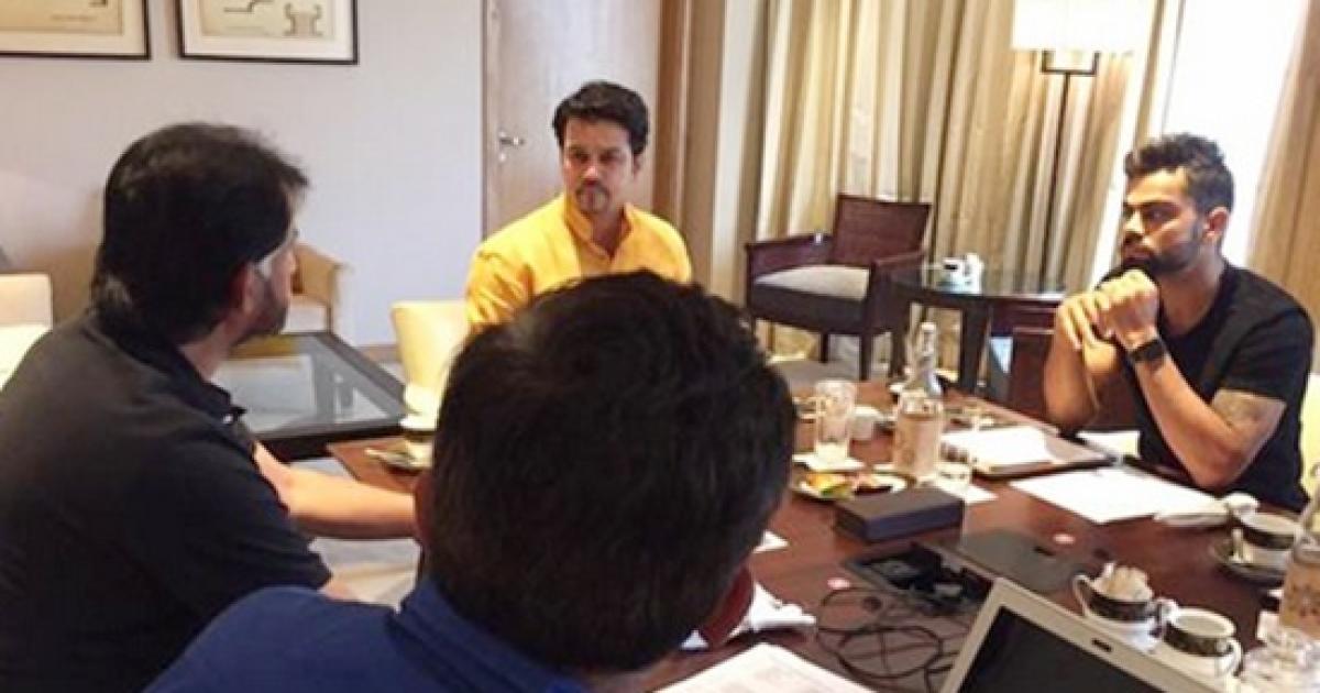 Chairman of selectors Sandeep Patil, Anurag Thakur and Virat Kohli at the selection committee meeting to pick the Test team for the tour of Sri Lanka. Photograph: BCCI/Twitter