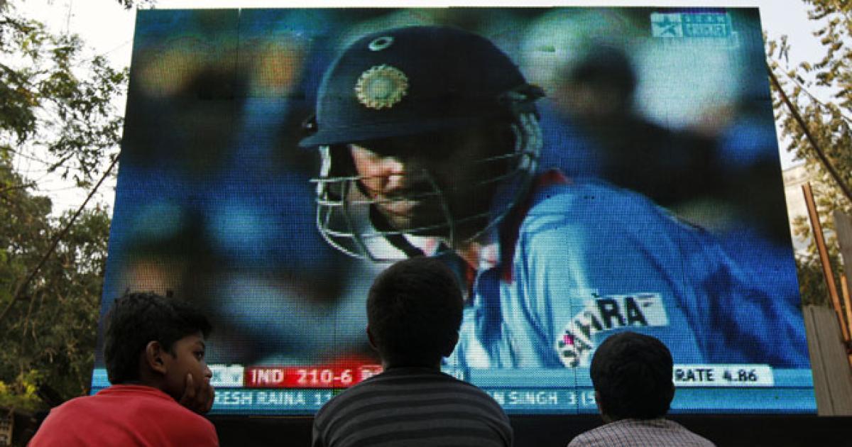 IMAGE: Children watch the 2011 ICC World Cup semi-final between India and Pakistan on a big screen in Mumbai. Photograph: Danish Siddiqui/Reuters