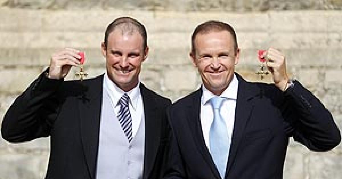 England skipper Andrew Strauss and coach Andy Flower received OBEs at Windsor Castle for guiding the team to Ashes victory in Australia.