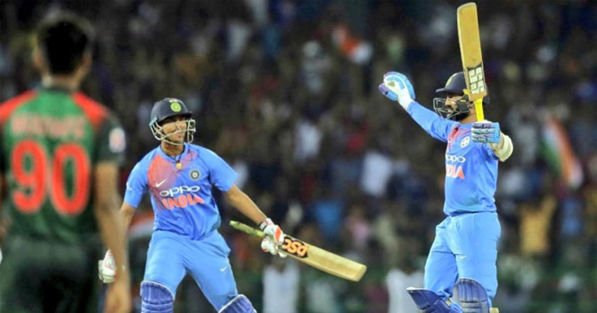 Wicket-keeper batsman Dinesh Karthik (29 of 8 balls) smashed a last-ball six as India pulled off a four-wicket win last night.