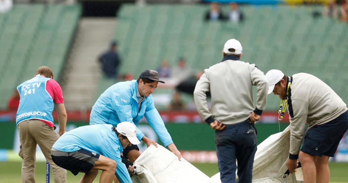 IMAGE: Ground Staff pull out rain covers before the ICC Men's T20 World Cup match between England and Ireland at Melbourne Cricket Ground on Wednesday. Photograph: Darrian Traynor/Getty Images