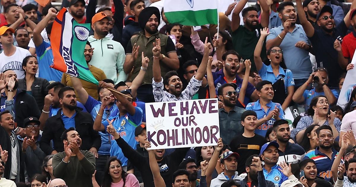 IMAGE: India supporters cheer their team during the ICC Men's T20 World Cup semi-final against England at the Adelaide Oval. Photograph: Mark Kolbe/Getty Images and Sarah Reed/Getty Images