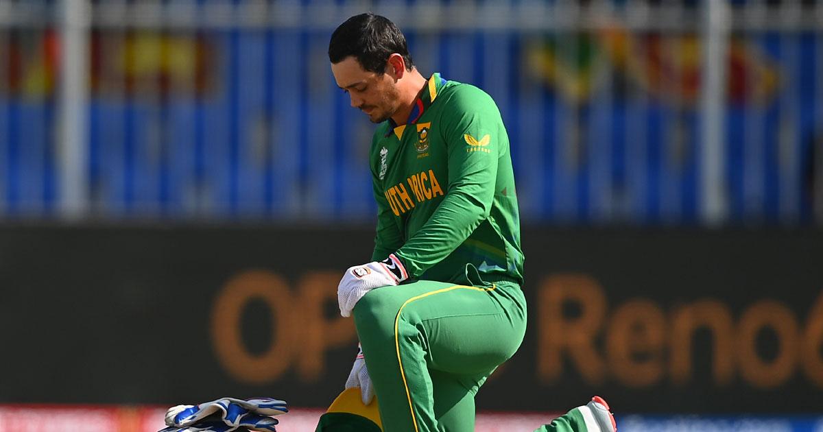 Opener Quinton de Kock took a knee in support of the Black Lives Matter movement as he returned to South Africa's playing XI for their Super 12 match at the T20 World Cup against Sri Lanka in Sharjah on Saturday.