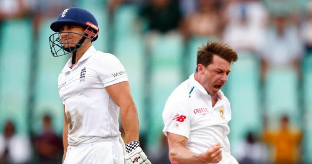 The home team welcomed their top bowler Steyn back after injury and he delivered a fiery burst to take the wickets of England captain Alastair Cook and debutant opener Alex Hales.