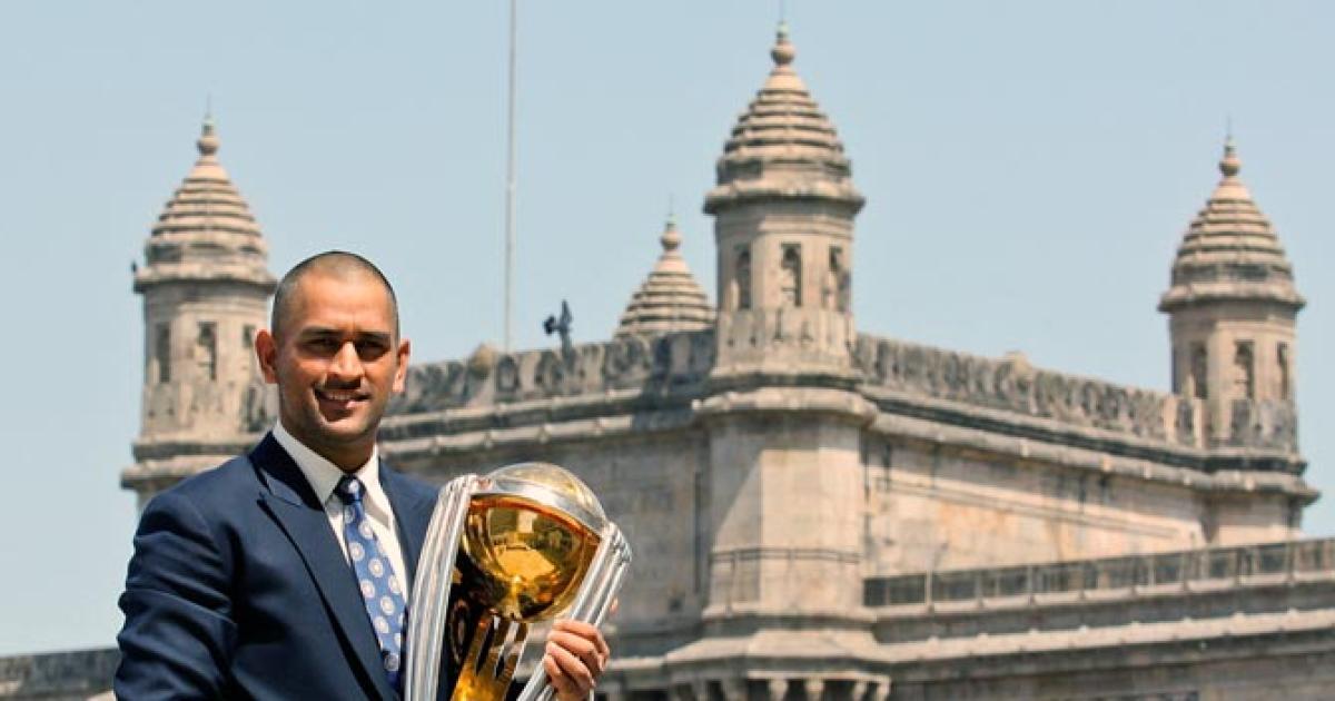 IMAGE: Captain Mahendra Singh Dhoni with the 2011 World Cup at the Gateway of India in Mumbai. Photograph: Ritam Banerjee/Getty Images