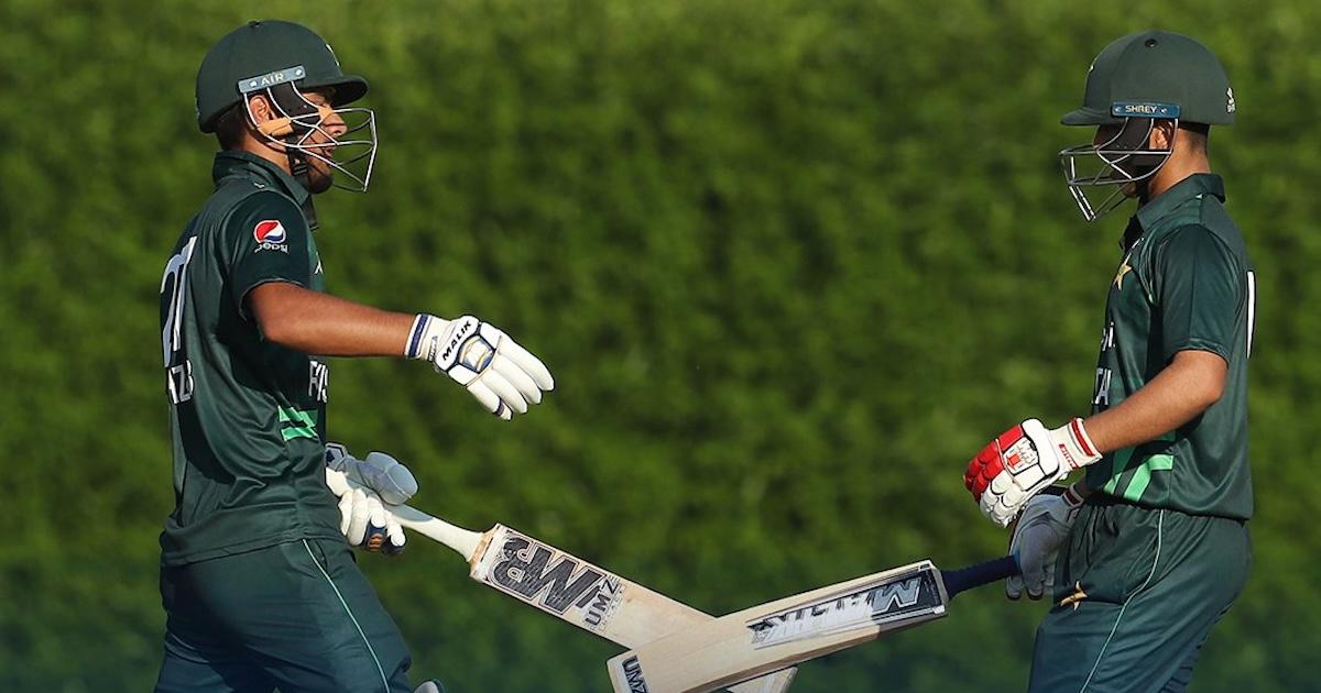 Pakistan 263/2 in 47 overs (Azan Awais 105 not out, Saab Baig 68 not out, Shazaib Khan 63, Murugan Abhishek 2/55)