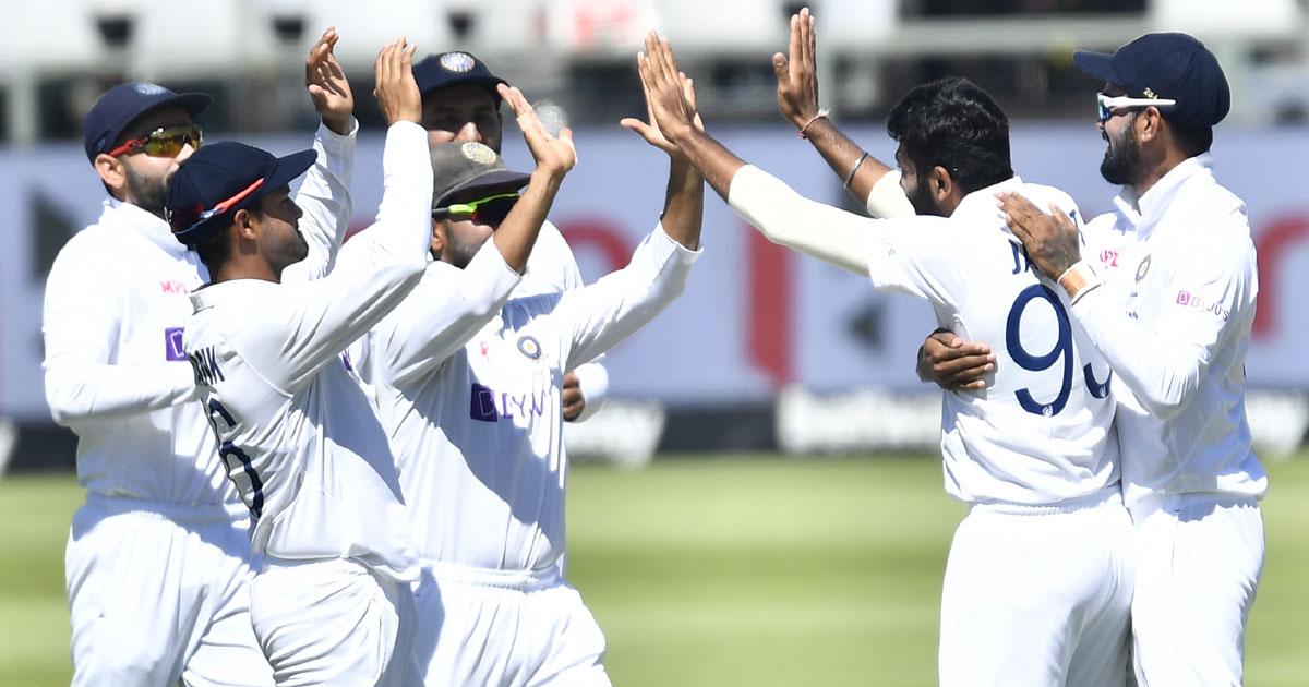 IMAGE: Jasprit Bumrah celebrates with team-mates after dismissing South African opener Aiden Markram in the morning session on Day 2. Bumrah's 5 wickets helped dismiss South Africa for 210. Photograph: Ashley Vlotman/Gallo Images/Getty Images