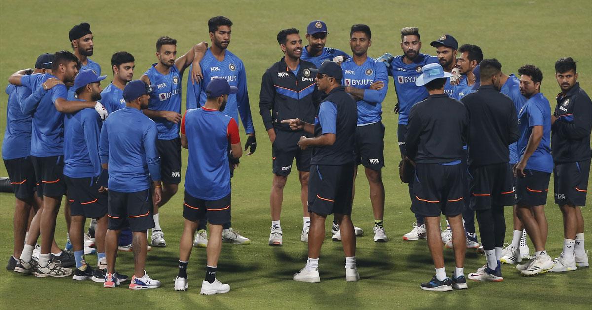 IMAGE: Head coach Rahul Dravid speaks to the Indian players during the training session. Photograph: BCCI/Twitter