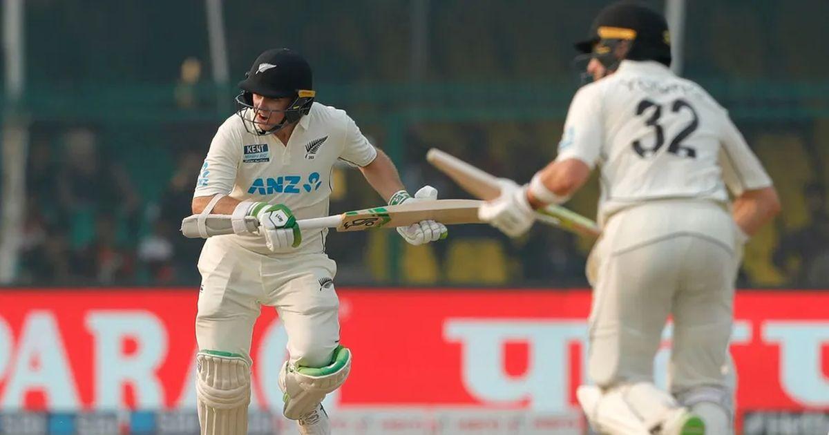 IMAGE: New Zealand openers Tom Latham and Will Young run between the wickets on day 2 of the first Test at the Green Park stadium in Kanpur. Photograph: BCCI