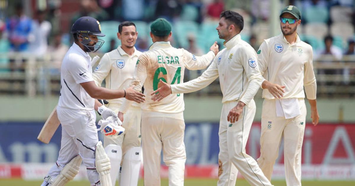 South African players celebrate the dismissal of India's Rohit Sharma on Day 2 of the 1st cricket Test match at Dr YS Rajasekhara Reddy ACA-VDCA Cricket Stadium, in Visakhapatnam, on Thursday
