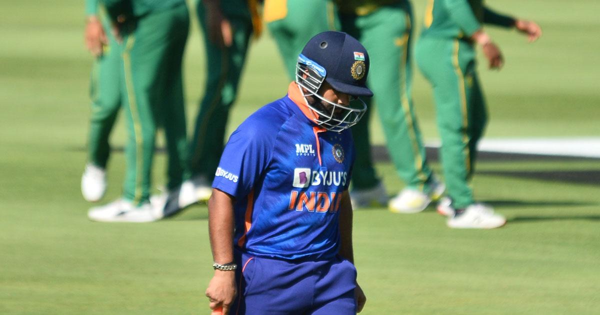 IMAGE: Rishabh Pant walks off after getting dismissed for a first-ball duck during the third ODI against South Africa in Cape Town, on Sunday. Photograph: Grant Pitcher/Gallo Images/Getty Images