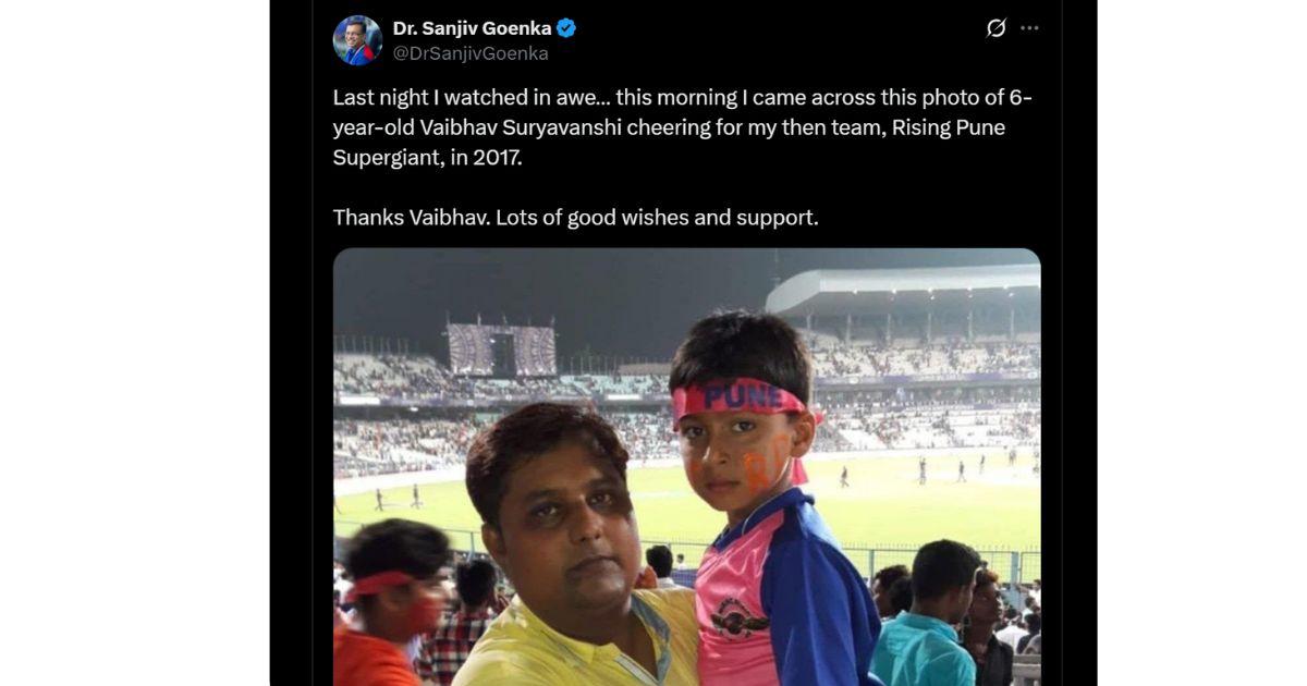 'Last night I watched in awe… this morning I came across this photo of 6-year-old Vaibhav Suryavanshi cheering for my then team, Rising Pune Supergiant, in 2017. Thanks Vaibhav. Lots of good wishes and support,' Goenka tweeted.