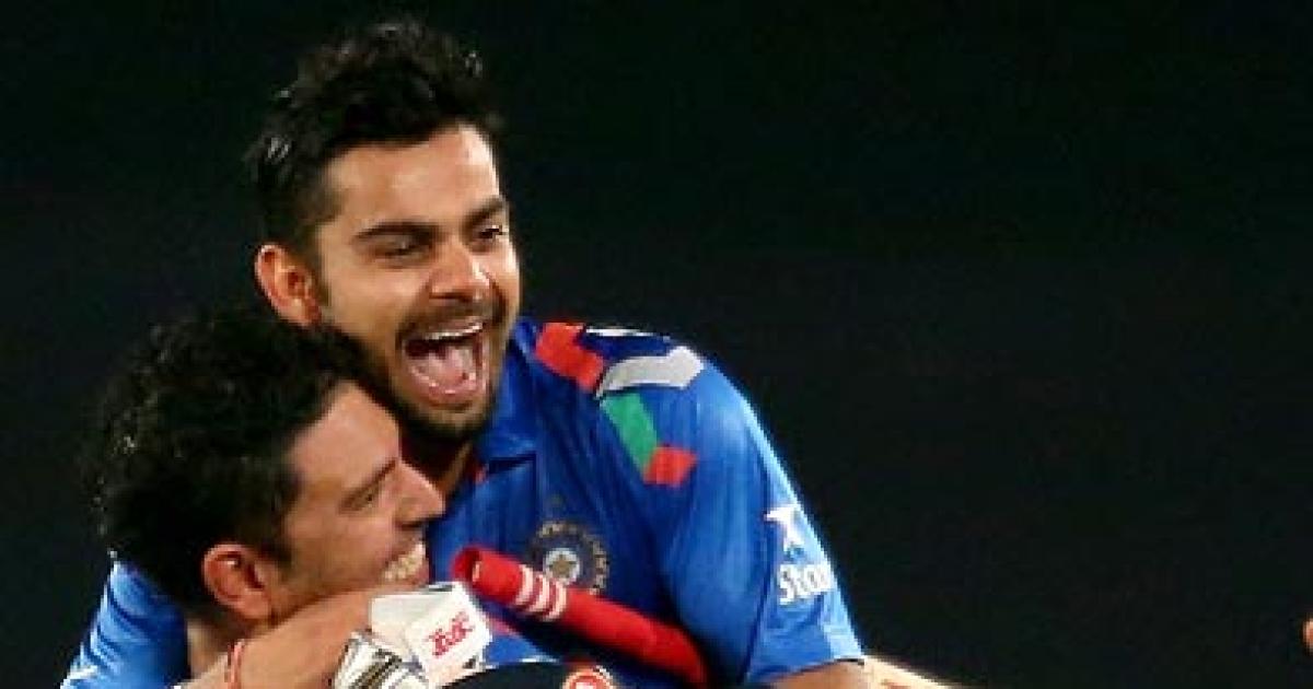Image: Virat Kohli is hugged by Yuvraj Singh after hitting the winning runs against South Africa in the ICC World Twenty20 semi-final.