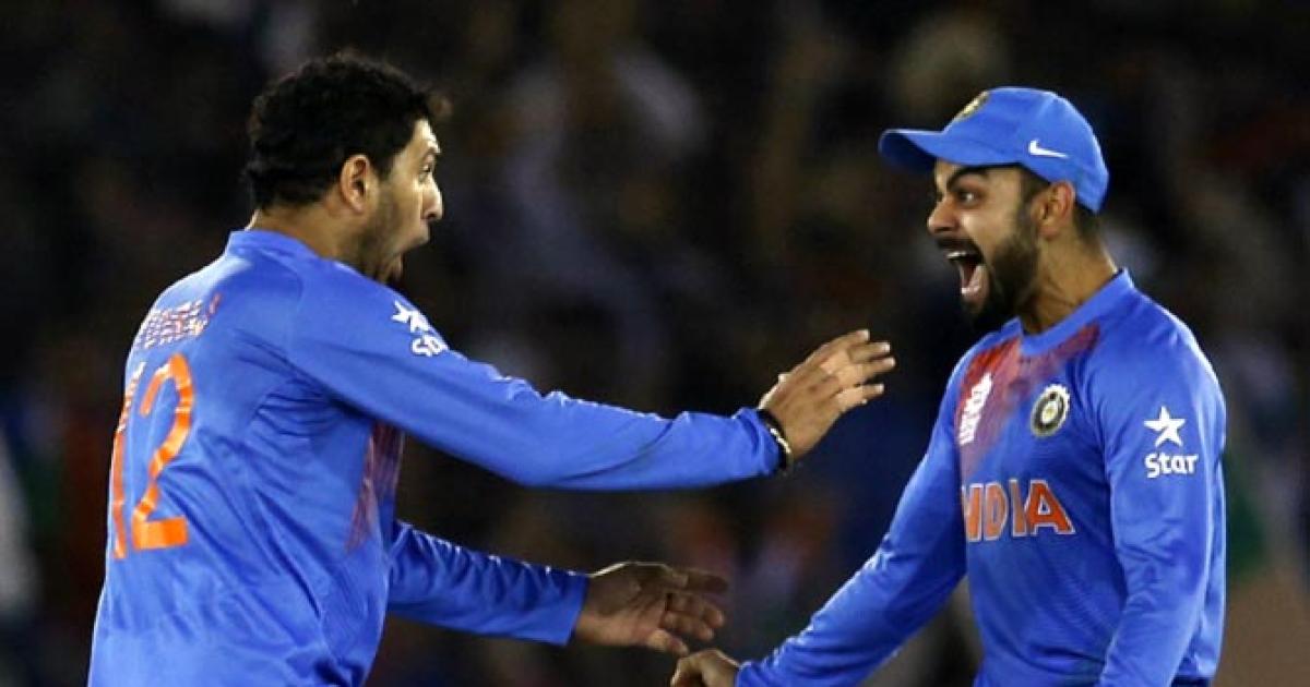 IMAGE: Yuvraj Singh, left, celebrates with his Virat Kohli after taking a wicket. Photograph: Adnan Abidi/Reuters