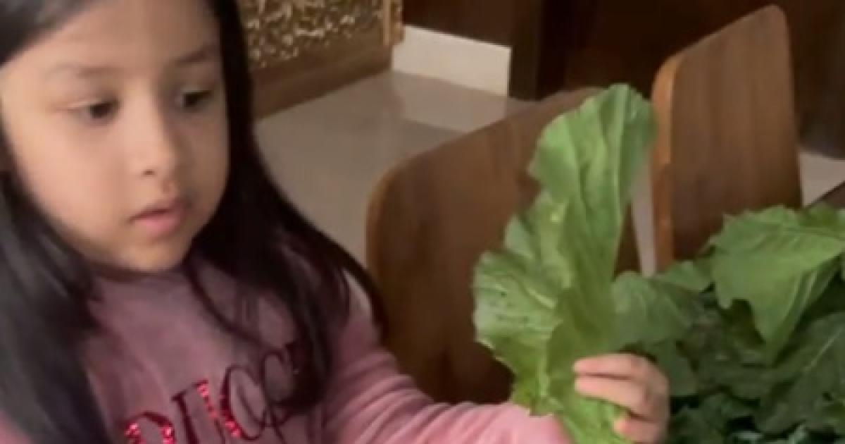 The child names each vegetable she picked: Kale, coriander, mustard greens, tomato, carrots and radish.