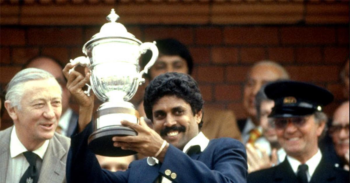 IMAGE: Captain Kapil Dev holds aloft the trophy after India won the World Cup in 1983. Photograph: Dave Cannon/Allsport