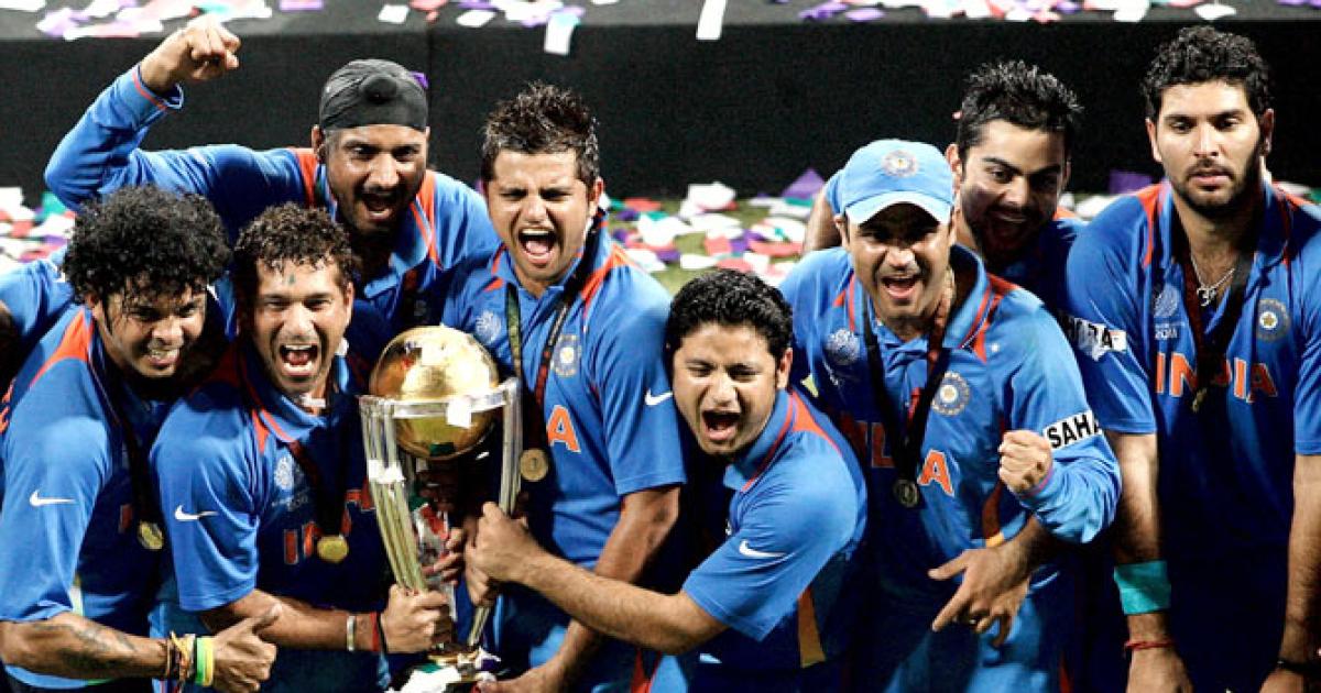 IMAGE: The Indians celebrate after they defeated Sri Lanka to win the ICC World Cup, April 2, 2011. Photograph: Graham Crouch/Getty Images